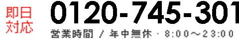 お客様は立ち会うだけ! ゴミの分別も必要ありません!お気軽にご連絡ください!お電話1本で即日対応!0120-745-301 営業時間 / 年中無休・8:00~23:00